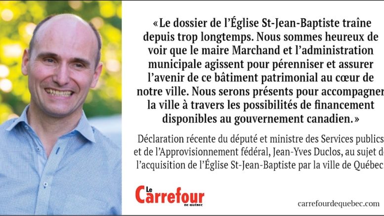 Déclaration récente du député et ministre des Services publics et de l’Approvisionnement fédéral, Jean-Yves Duclos, au sujet de l’acquisition de l’Église St-Jean-Baptiste par la ville de Québec.
