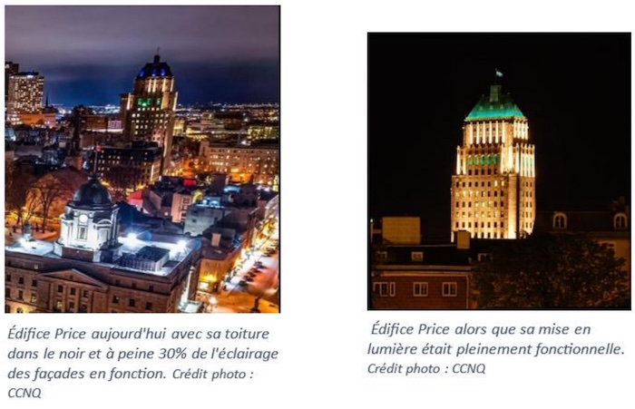 « On considère également pour l’édifice Price, même si c’est un immeuble privé, qu’il devrait y avoir des démarches pour reprendre la mise en lumière de celui-ci compte tenu de son importance dans le paysage visuel nocturne de la ville de Québec » a-t-il ajouté.