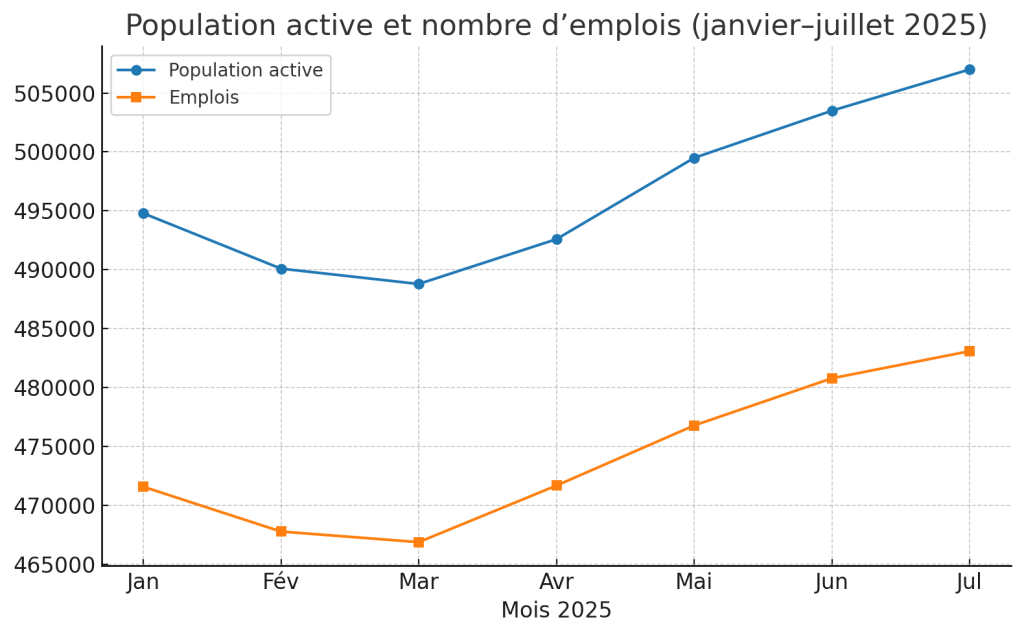 Malgré la hausse du nombre d’emplois dans la région en juillet, le taux de chômage a tout de même augmenté de 0,2 point pour atteindre 4,7 %. Cette situation s’explique notamment par une croissance de la population active (+0,7 %) plus élevée que celle de l’emploi (+0,5 %).