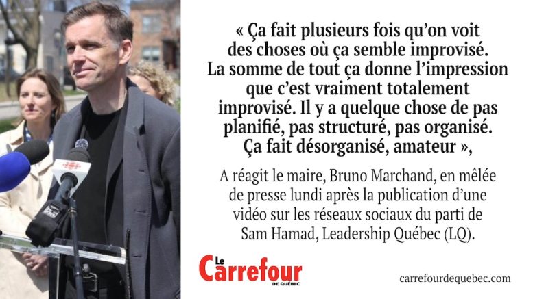 A réagi le maire, Bruno Marchand, en mêlée de presse lundi dernier, après la publication d’une vidéo sur les réseaux sociaux du parti de Sam Hamad, Leadership Québec (LQ).