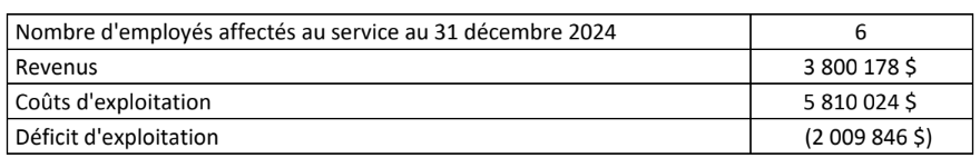Au 31 décembre 2024, six employés étaient affectés aux activités du service. Les revenus d’àVélo se chiffraient à 3 800 178 $ et les coûts d’exploitation à 5 810 024 $, pour un déficit d’opération de 2 009 846 $, en légère baisse comparé à celui de 2023 qui s’établissait à 2 280 838 $.