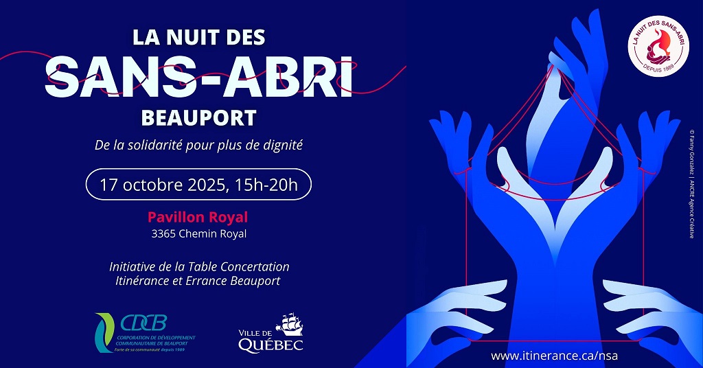 76 regroupements auront lieu partout au Québec le vendredi 17 octobre. Localement, des événements sont organisés à Charlesbourg, Sainte-Foy, Loretteville et Saint-Roch, en plus de celui à Beauport. Pour plus d’informations, visitez le itinerance.ca/nsa.