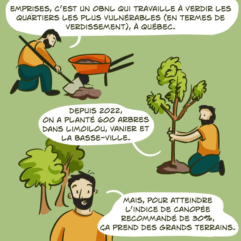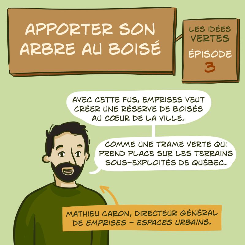 La série BD Les idées vertes vous fait découvrir des initiatives écologiques menées par des organismes, citoyens et entreprises de Québec. Dans ce troisième épisode, on fait la connaissance de Mathieu, directeur général de Emprises – Espaces urbains et limoulois de cœur.