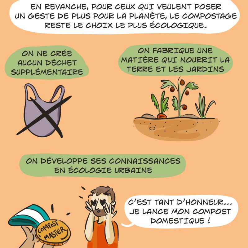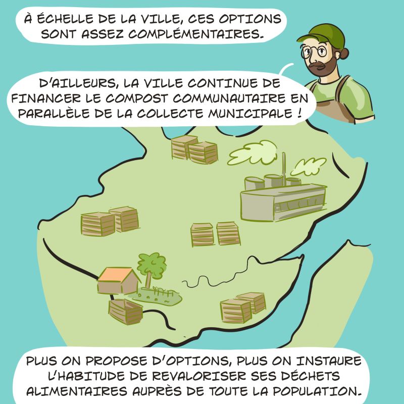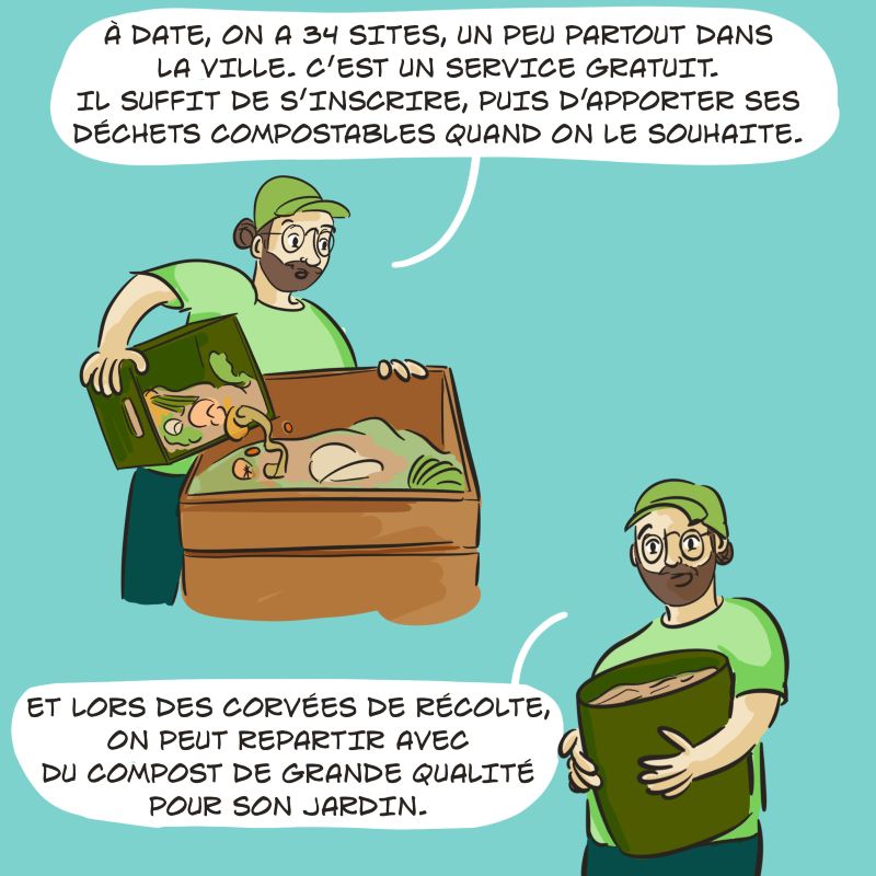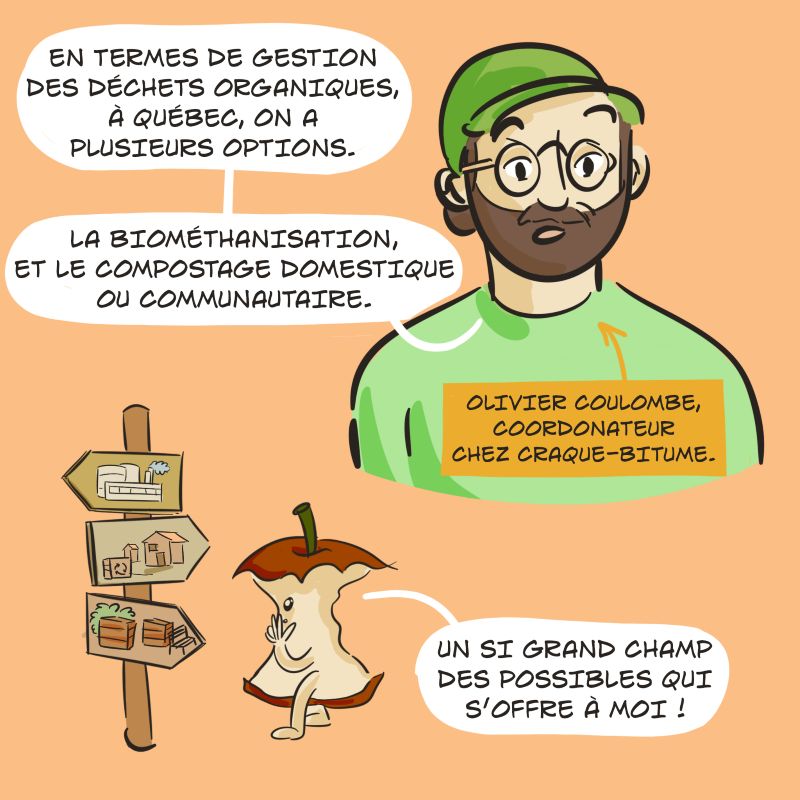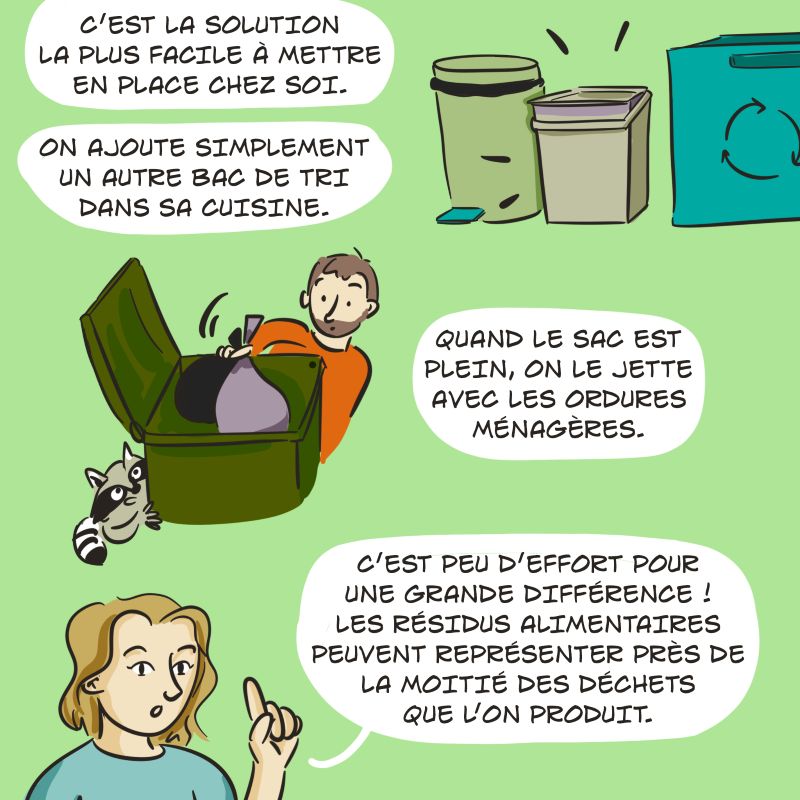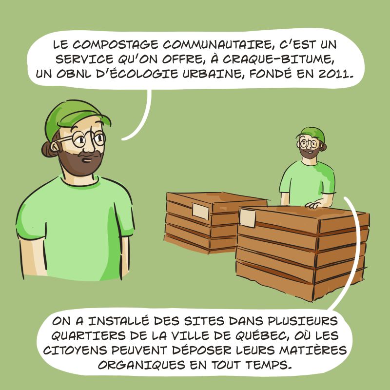 La série BD Les idées vertes vous fait découvrir des initiatives écologiques menées par des organismes, citoyens et entreprises de Québec. Dans ce quatrième épisode, on prend un moment pour se pencher sur le tri des résidus alimentaires et ses différentes options, dont le compostage communautaire de l’OBNL Craque-Bitume.