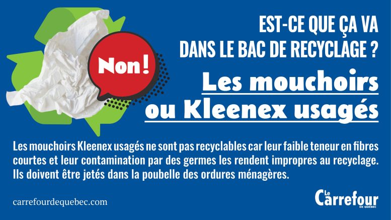 Les mouchoirs sont le réceptacle de microbes et de saletés, ce qui peut contaminer l’ensemble du flux de recyclage des papiers.
