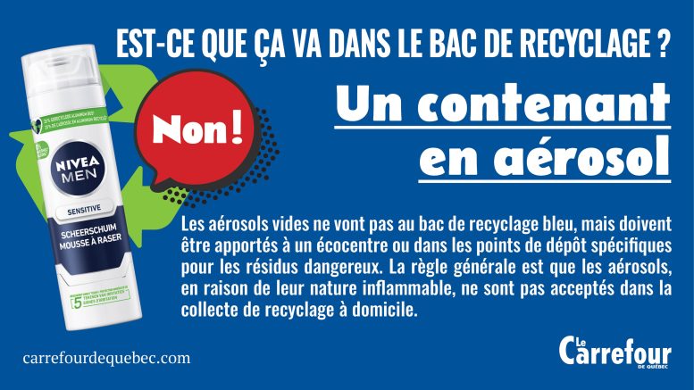 Les aérosols vides ne vont pas au bac de recyclage bleu, mais doivent être apportés à un écocentre ou dans les points de dépôt spécifiques pour les résidus dangereux.