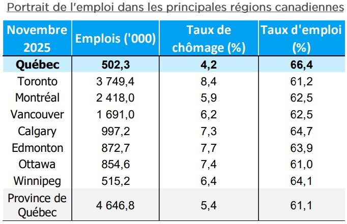 À 4,2 %, le taux de chômage de Québec est bien en deçà de celui des autres grandes villes du pays. La moyenne québécoise de 5,4 % est également supérieure à celle dans la Vieille Capitale.