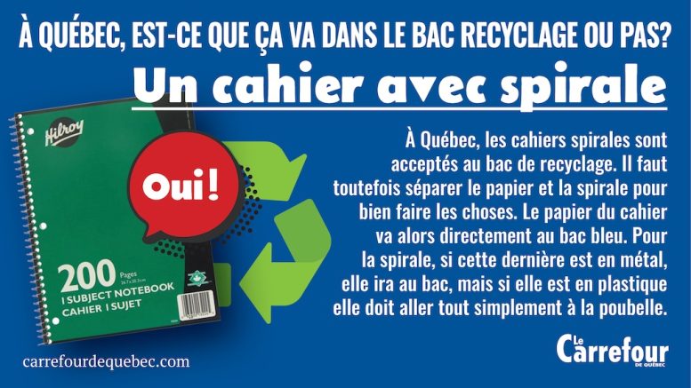 À Québec, les cahiers spirales sont acceptés au bac de recyclage. Il faut toutefois séparer le papier et la spirale pour bien faire les choses.
