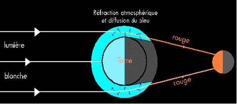 Lorsqu’elle traverse l’ombre de la Terre, la Lune prend une teinte rouge plus ou moins prononcée. La seule lumière qui parvient alors jusqu’à sa surface est celle du Soleil filtrée par l’atmosphère terrestre. En traversant cette couche d’air, la lumière blanche est dispersée : les couleurs bleues et vertes sont diffusées, tandis que les teintes rouges continuent leur chemin jusqu’à la Lune. Ce filtrage lui donne sa couleur cuivrée, comme lors d’un coucher de Soleil.