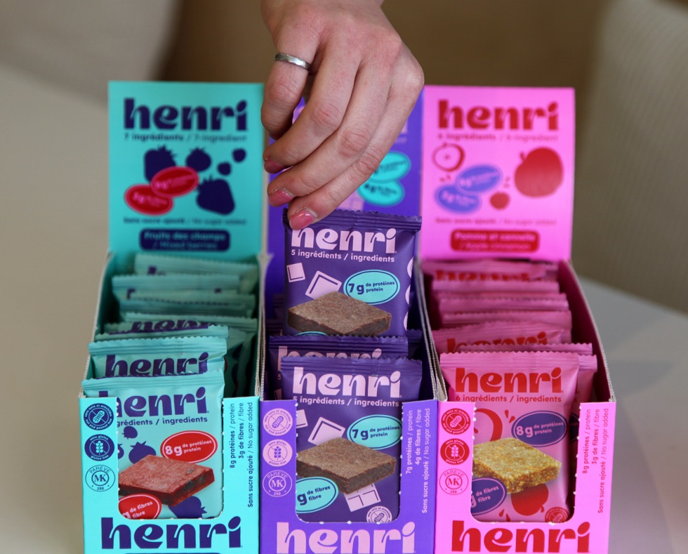 Les barres Henri misent sur la simplicité. Comptant tout au plus sept ingrédients, sans sucre ajouté et sans allergènes, elles répondent à une volonté de nombreux parents d’offrir une collation saine à leurs enfants. La mère, qui possède une expertise en génie alimentaire, a développé elle-même les recettes pour qu’elles s’intègrent au quotidien des familles.