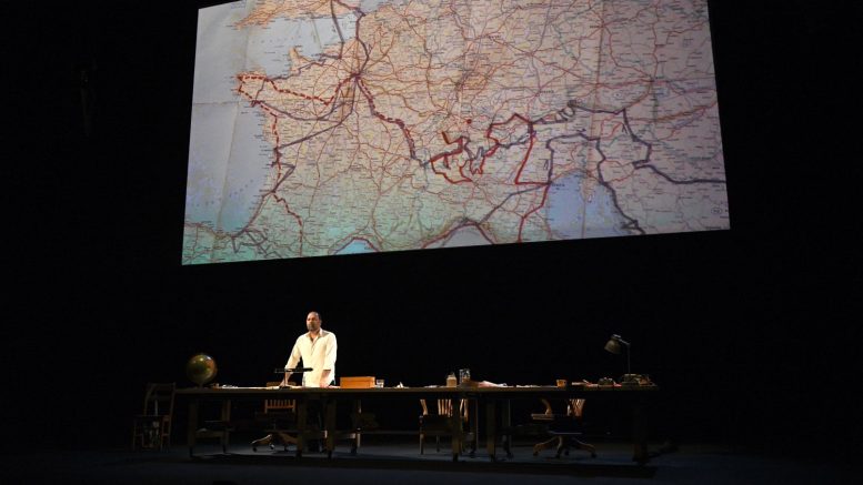Sur scène, un bureau encombré de documents, de cartes postales et d’objets d’époque devient le point de départ du récit. Au-dessus, un écran projette ces archives, mêlant images anciennes et captations contemporaines. Certaines cartes postales prennent vie, laissant apparaître le personnage du père dans les lieux qu’il a traversés.
