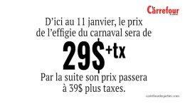 –D’ici au 11 janvier, le prix de l’effigie du carnaval sera de 29$ plus taxes. Par la suite son prix…