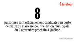 -8 personnes sont officiellement candidates au poste de maire ou mairesse pour l’élection municipale du 2 novembre prochain à Québec. À…